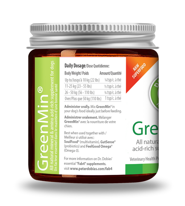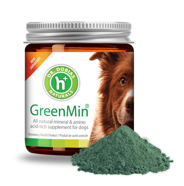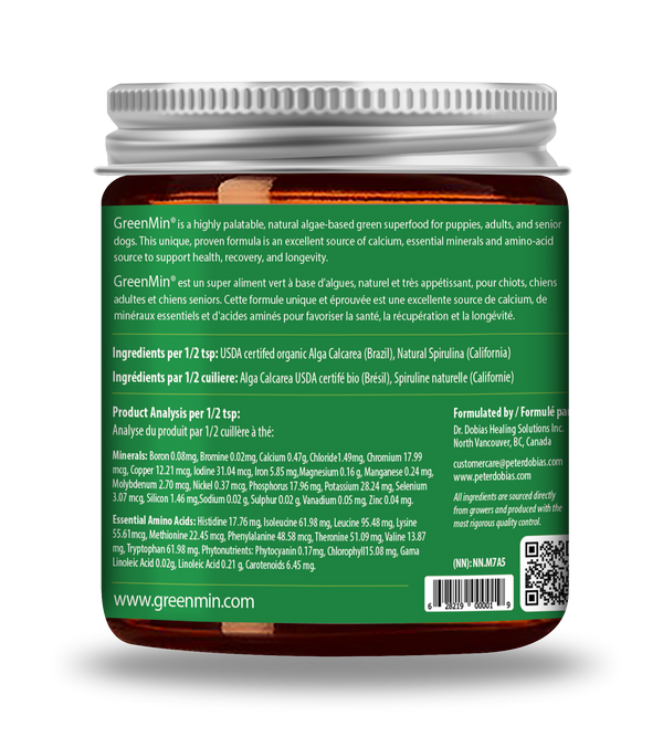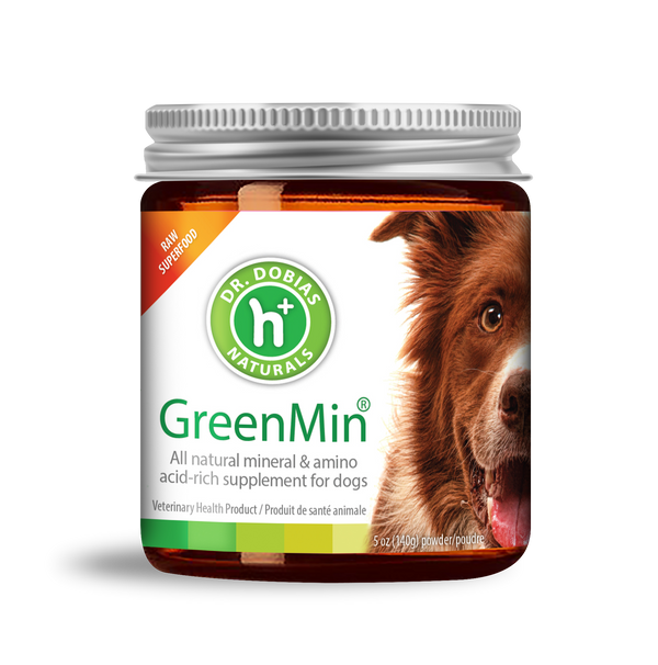 GreenMin is an all natural, plant-based, calcium, mineral and amino-acid rich, green superfood supplement for dogs. GreenMin helps eliminate harmful heavy metals and toxins and is rigorously tested and free of heavy metals and toxins.