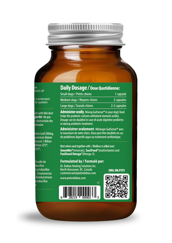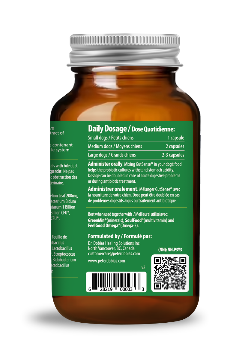 Open the capsule and mix GutSense in your dog’s food. (or place the whole capsule in the meal) Giving with a meal helps the probiotic cultures withstand stomach acidity.