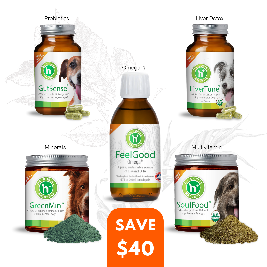 The bundle contains the following products: FeelGood Omega®, GutSense®, SoulFood®, GreenMin® and LiverTune®.