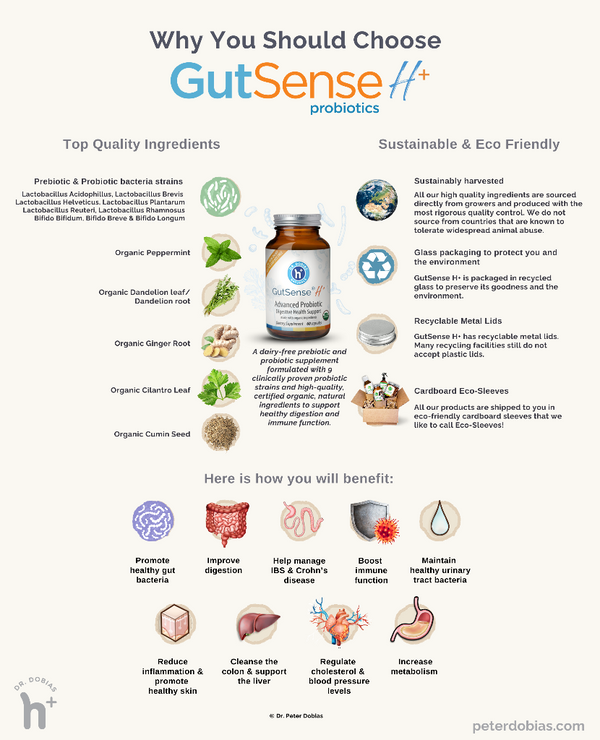 Unlike most probiotic supplements, GutSense H+ is enriched with a unique blend of organic medicinal herbs that can improve digestion and nutrient absorption, regulate bowel movements, and gently detox your body from toxins and heavy metals.