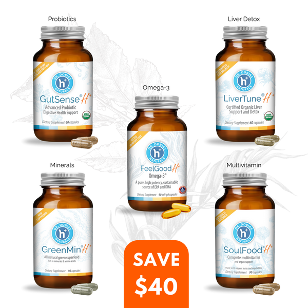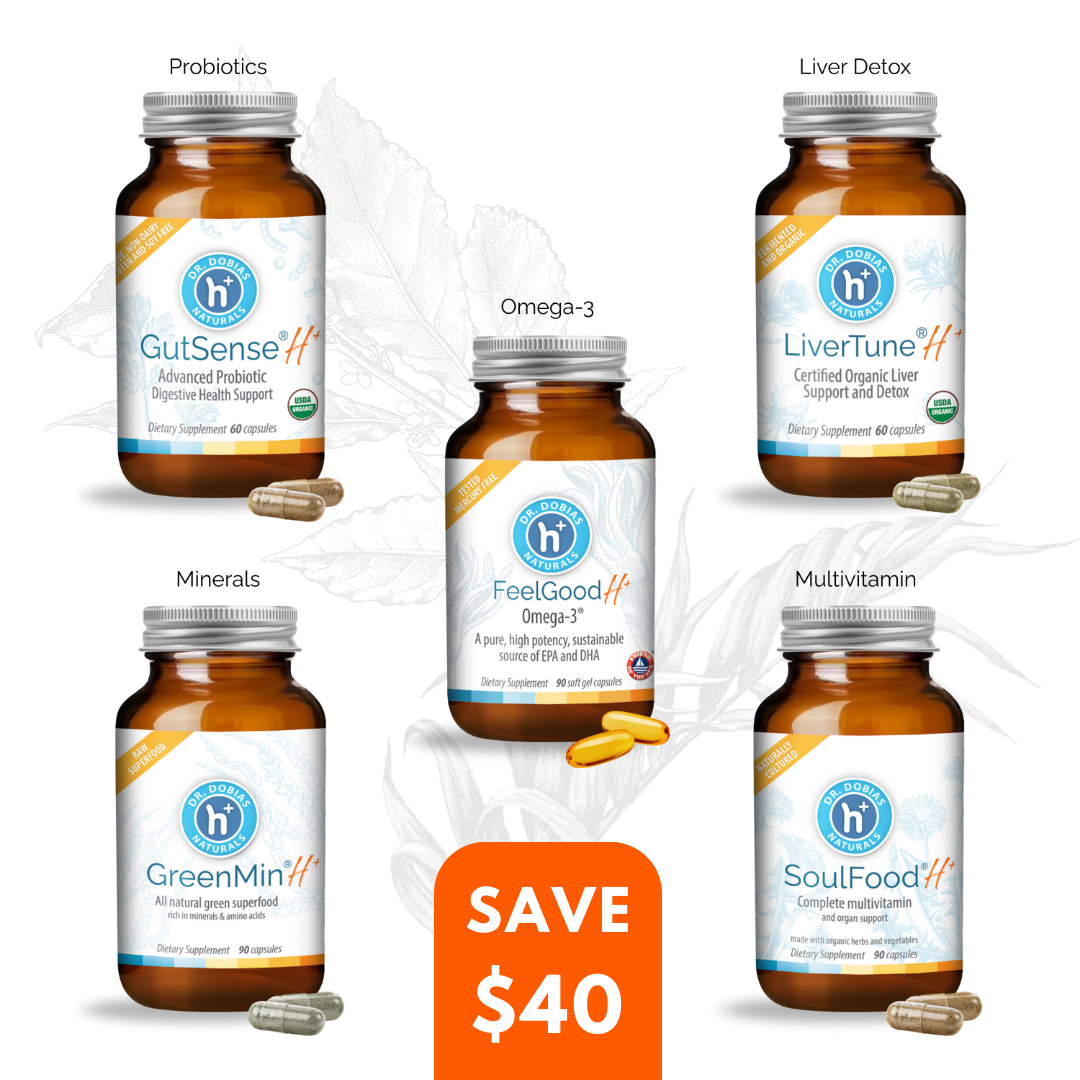 The bundle contains the following products: FeelGood Omega H+, SoulFood H+, GreenMin H+, GutSense H+ and LiverTune H+.