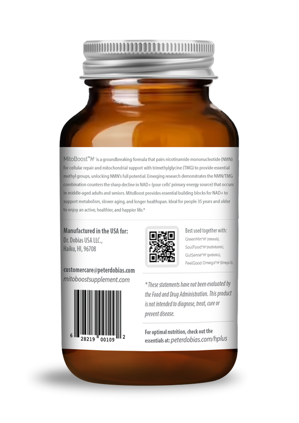 Because the aging body gradually loses the ability to produce NMN (which to our knowledge cannot be reversed), MitoBoost H+ is intended for long term use. NMN has been available as a human supplement for more than a decade, with notable positive impacts on human health and well being with no reports of any harmful effects.